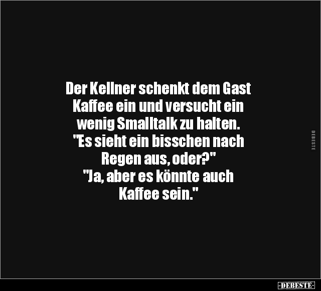 Der Kellner schenkt dem Gast Kaffee ein und versucht ein wenig Smalltalk zu halten. "Es sieht ein bisschen nach Regen aus, oder?" "Ja, aber es könnte auch Kaffee sein."
