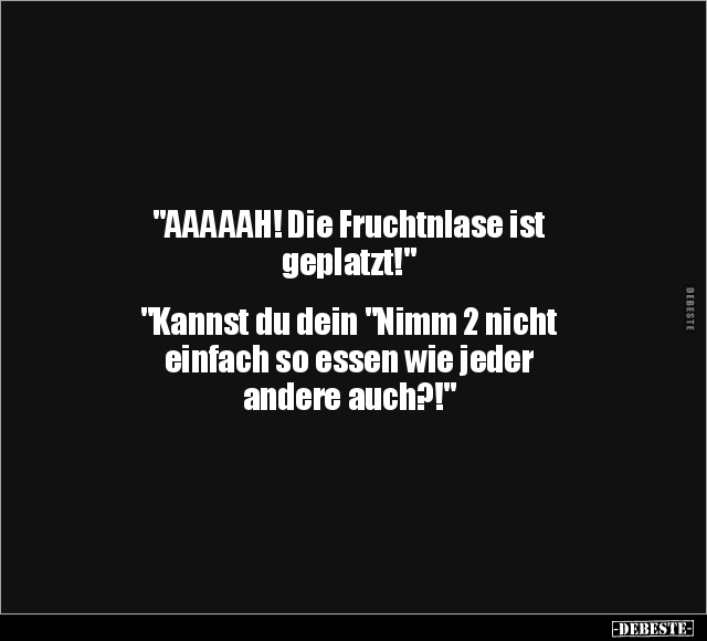 "AAAAAH! Die Fruchtnlase ist geplatzt!" "Kannst du dein "Nimm 2 nicht einfach so essen wie jeder andere auch?!"