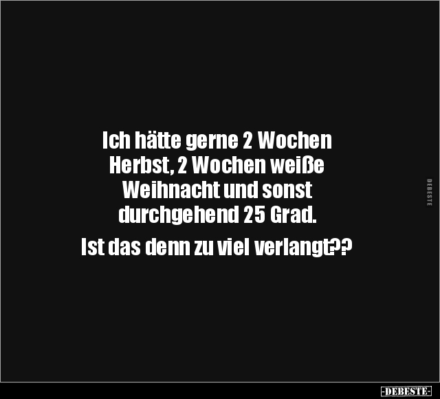 Ich hätte gerne 2 Wochen Herbst, 2 Wochen weiße Weihnacht und sonst durchgehend 25 Grad. Ist das denn zu viel verlangt??