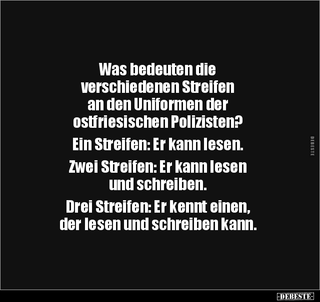 Was bedeuten die verschiedenen Streifen an den Uniformen der ostfriesischen Polizisten? Ein Streifen: Er kann lesen. Zwei Streifen: Er kann lesen und schreiben. Drei Streifen: Er kennt einen, der lesen und schreiben kann.