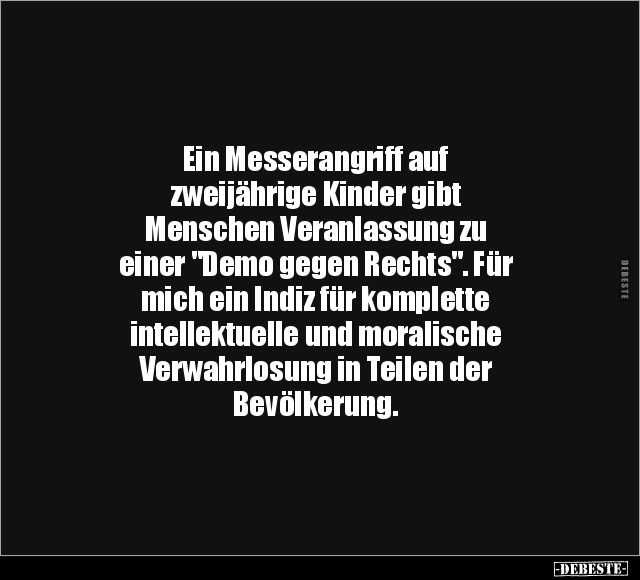 Ein Messerangriff auf zweijährige Kinder gibt Menschen Veranlassung zu einer "Demo gegen Rechts". Für mich ein Indiz für komplette intellektuelle und moralische Verwahrlosung in Teilen der Bevölkerung.