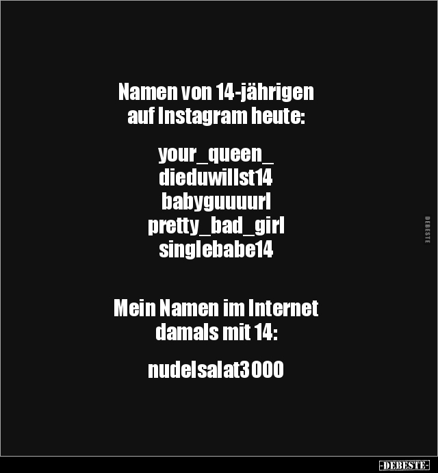 Namen von 14-jährigen auf Instagram heute: your_queen_ dieduwillst14 babyguuuurl pretty_bad_girl singlebabe14 Mein Namen im Internet damals mit 14: nudelsalat3000