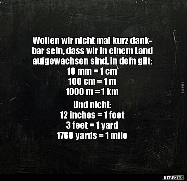 Wollen wir nicht mal kurz dank- bar sein, dass wir in einem Land aufgewachsen sind, in dem gilt: 10 mm = 1 cm 100 cm = 1 m 1000 m = 1 km Und nicht: 12 inches = 1 foot 3 feet = 1 yard 1760 yards = 1 mile