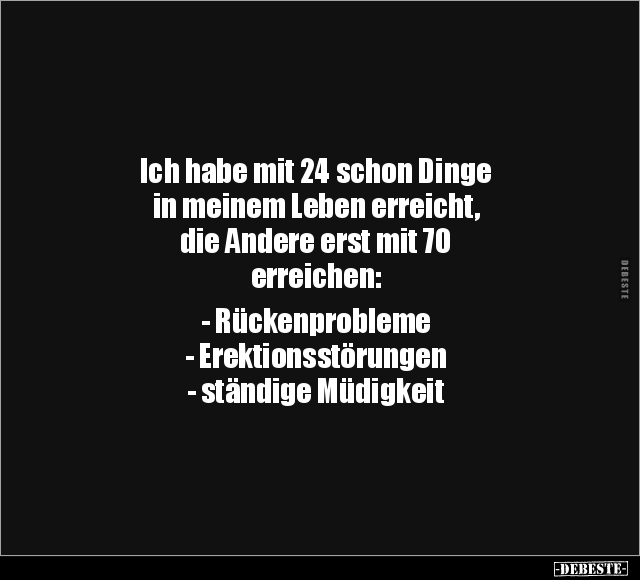 Ich habe mit 24 schon Dinge in meinem Leben erreicht, die Andere erst mit 70 erreichen: - Rückenprobleme - Erektionsstörungen - ständige Müdigkeit