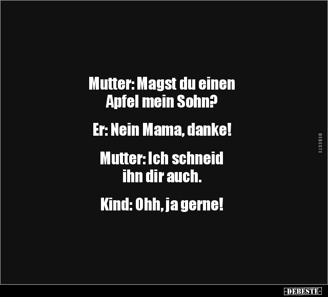 Mutter: Magst du einen Apfel mein Sohn? Er: Nein Mama, danke! Mutter: Ich schneid ihn dir auch. Kind: Ohh, ja gerne!
