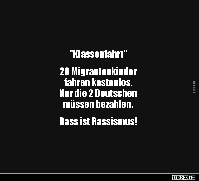 "Klassenfahrt" 20 Migrantenkinder fahren kostenlos. Nur die 2 Deutschen müssen bezahlen. Dass ist Rassismus!
