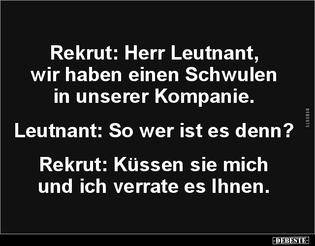 Rekrut: Herr Leutnant, wir haben einen Schwulen in unserer Kompanie. Leutnant: So wer ist es denn? Rekrut: Küssen sie mich und ich verrate es Ihnen.