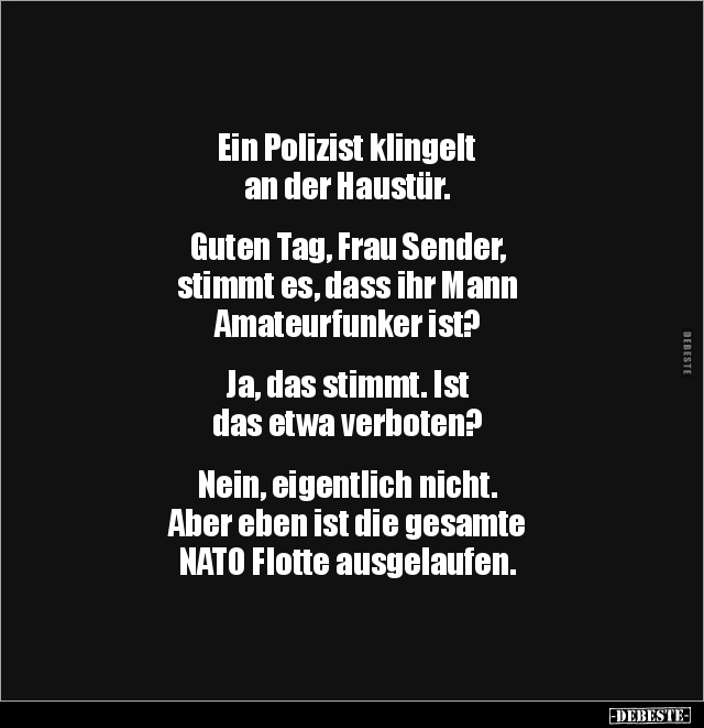 Ein Polizist klingelt an der Haustür. Guten Tag, Frau Sender, stimmt es, dass ihr Mann Amateurfunker ist? Ja, das stimmt. Ist das etwa verboten? Nein, eigentlich nicht. Aber eben ist die gesamte NATO Flotte ausgelaufen.