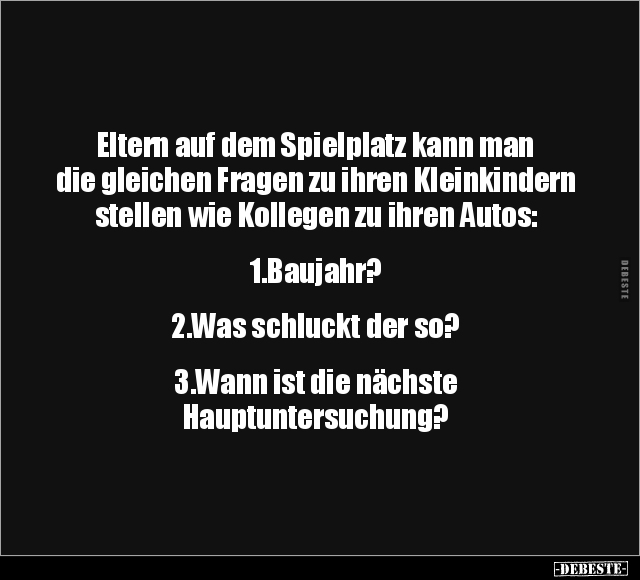 Eltern auf dem Spielplatz kann man die gleichen Fragen zu ihren Kleinkindern stellen wie Kollegen zu ihren Autos: 1.Baujahr? 2.Was schluckt der so? 3.Wann ist die nächste Hauptuntersuchung?