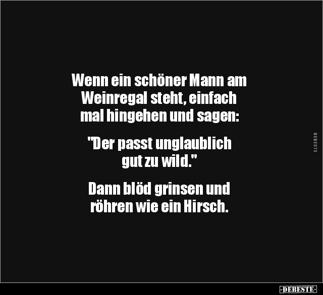 Wenn ein schöner Mann am Weinregal steht, einfach mal hingehen und sagen: "Der passt unglaublich gut zu wild." Dann blöd grinsen und röhren wie ein Hirsch.