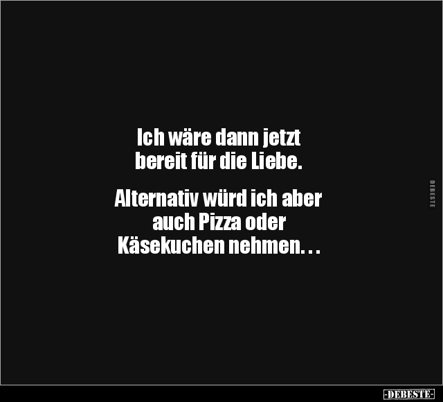 Ich wäre dann jetzt bereit für die Liebe. Alternativ würd ich aber auch Pizza oder Käsekuchen nehmen. . .