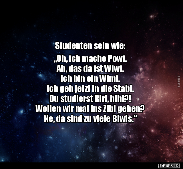 Studenten sein wie: „Oh, ich mache Powi. Ah, das da ist Wiwi. Ich bin ein Wimi. Ich geh jetzt in die Stabi. Du studierst Riri, hihi?! Wollen wir mal ins Zibi gehen? Ne, da sind zu viele Biwis.“