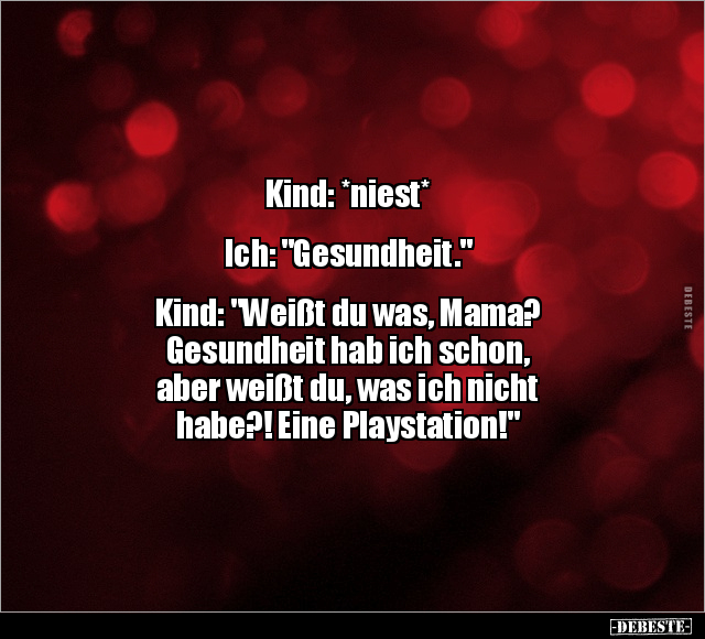 Kind: *niest* Ich: "Gesundheit." Kind: "Weißt du was, Mama? Gesundheit hab ich schon, aber weißt du, was ich nicht habe?! Eine Playstation!"
