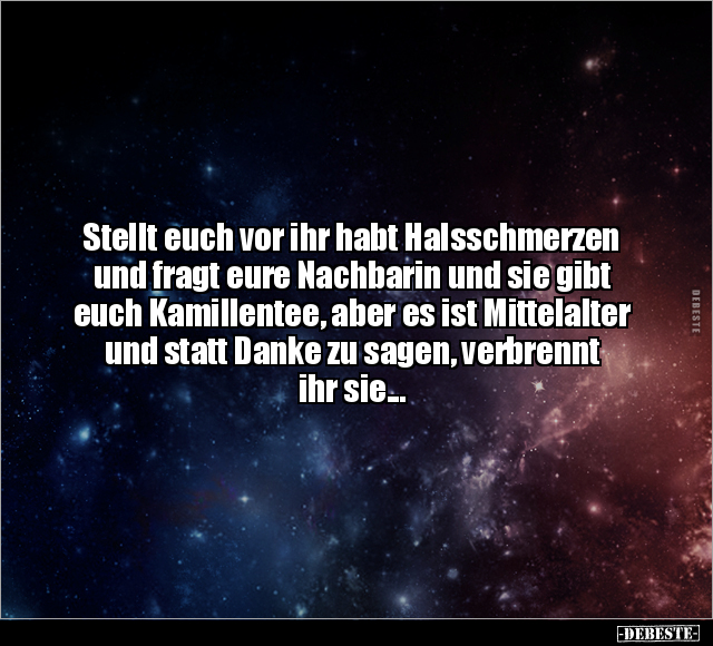 Stellt euch vor ihr habt Halsschmerzen und fragt eure Nachbarin und sie gibt euch Kamillentee, aber es ist Mittelalter und statt Danke zu sagen, verbrennt ihr sie...
