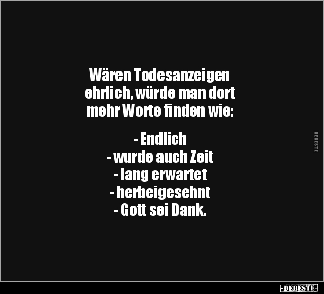 Wären Todesanzeigen ehrlich, würde man dort mehr Worte finden wie: - Endlich - wurde auch Zeit - lang erwartet - herbeigesehnt - Gott sei Dank.