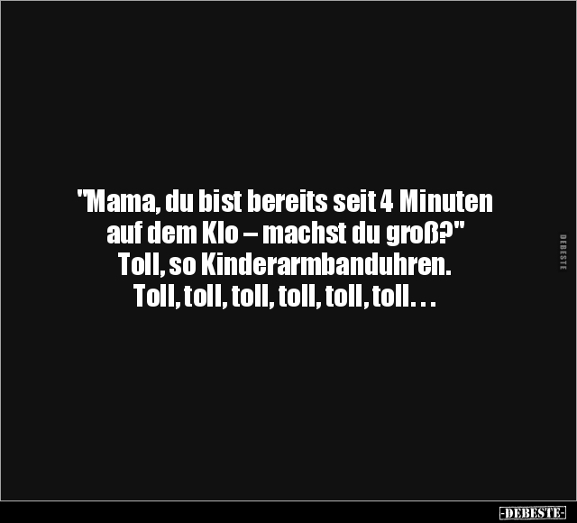 "Mama, du bist bereits seit 4 Minuten auf dem Klo – machst du groß?" Toll, so Kinderarmbanduhren. Toll, toll, toll, toll, toll, toll. . .