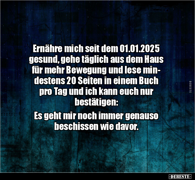 Ernähre mich seit dem 01.01.2025 gesund, gehe täglich aus dem Haus für mehr Bewegung und lese min- destens 20 Seiten in einem Buch pro Tag und ich kann euch nur bestätigen: Es geht mir noch immer genauso beschissen wie davor.