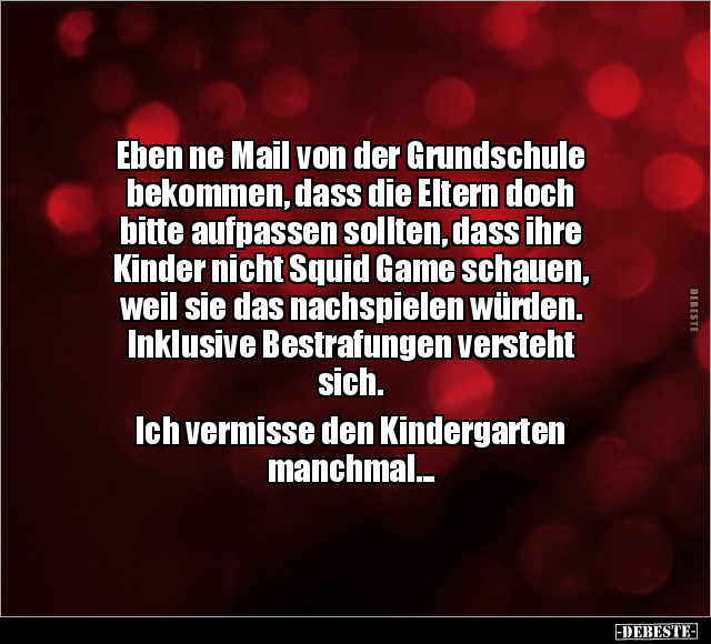 Eben ne Mail von der Grundschule bekommen, dass die Eltern doch bitte aufpassen sollten, dass ihre Kinder nicht Squid Game schauen, weil sie das nachspielen würden. Inklusive Bestrafungen versteht sich. Ich vermisse den Kindergarten manchmal...