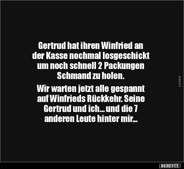 Gertrud hat ihren Winfried an der Kasse nochmal losgeschickt um noch schnell 2 Packungen Schmand zu holen. Wir warten jetzt alle gespannt auf Winfrieds Rückkehr. Seine Gertrud und ich… und die 7 anderen Leute hinter mir...