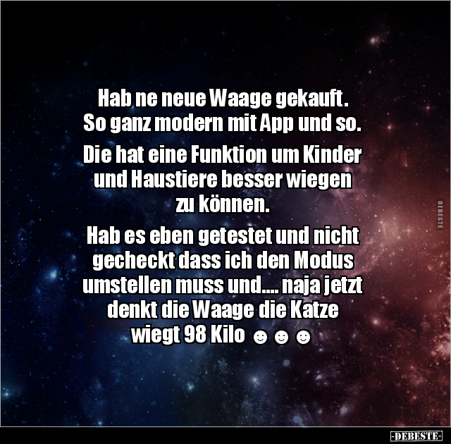 Hab ne neue Waage gekauft. So ganz modern mit App und so. Die hat eine Funktion um Kinder und Haustiere besser wiegen zu können. Hab es eben getestet und nicht gecheckt dass ich den Modus umstellen muss und.... naja jetzt denkt die Waage die Katze wiegt 98 Kilo ☻☻☻