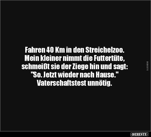 Fahren 40 Km in den Streichelzoo. Mein kleiner nimmt die Futtertüte, schmeißt sie der Ziege hin und sagt: "So. Jetzt wieder nach Hause." Vaterschaftstest unnötig.
