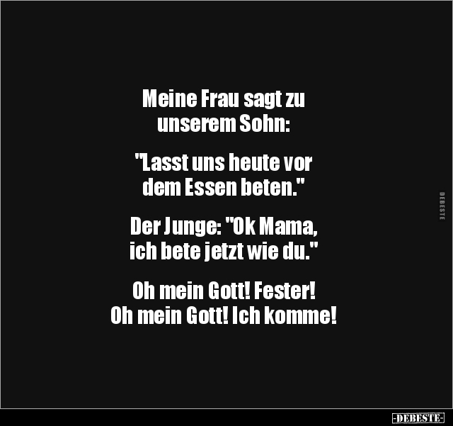 Meine Frau sagt zu unserem Sohn: "Lasst uns heute vor dem Essen beten." Der Junge: "Ok Mama, ich bete jetzt wie du." Oh mein Gott! Fester! Oh mein Gott! Ich komme!