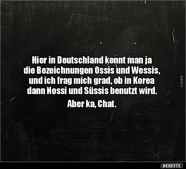 Hier in Deutschland kennt man ja die Bezeichnungen Ossis und Wessis, und ich frag mich grad, ob in Korea dann Nossi und Süssis benutzt wird. Aber ka, Chat.