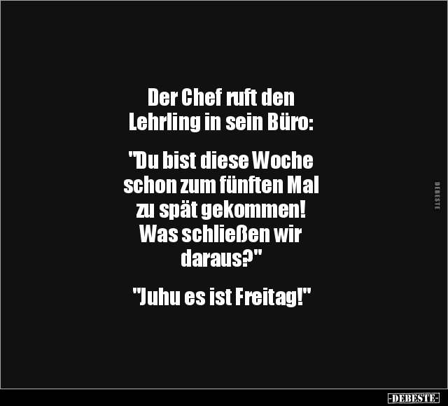Der Chef ruft den Lehrling in sein Büro: "Du bist diese Woche schon zum fünften Mal zu spät gekommen! Was schließen wir daraus?" "Juhu es ist Freitag!"