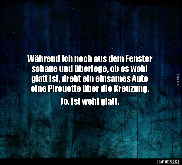 Während ich noch aus dem Fenster schaue und überlege, ob es wohl glatt ist, dreht ein einsames Auto eine Pirouette über die Kreuzung. Jo. Ist wohl glatt.