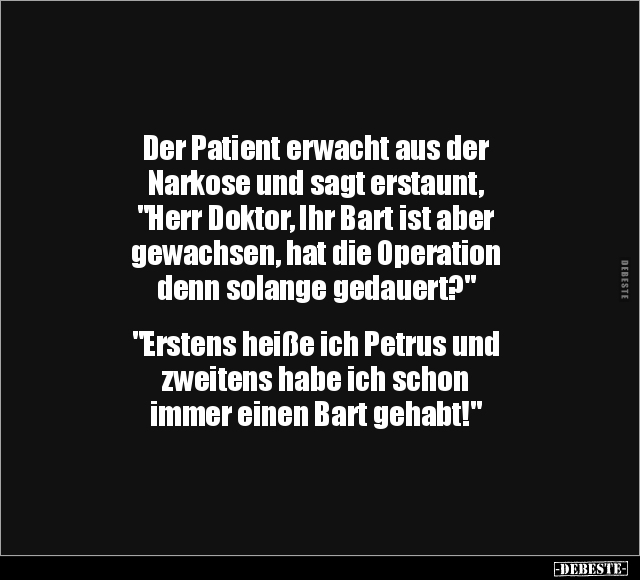 Der Patient erwacht aus der Narkose und sagt erstaunt, "Herr Doktor, Ihr Bart ist aber gewachsen, hat die Operation denn solange gedauert?" "Erstens heiße ich Petrus und zweitens habe ich schon immer einen Bart gehabt!"