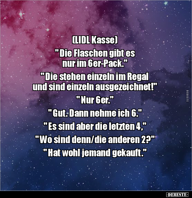 (LIDL Kasse) " Die Flaschen gibt es nur im 6er-Pack." " Die stehen einzeln im Regal und sind einzeln ausgezeichnet!" " Nur 6er." " Gut. Dann nehme ich 6." " Es sind aber die letzten 4," " Wo sind denn/die anderen 2?" " Hat wohl jemand gekauft."