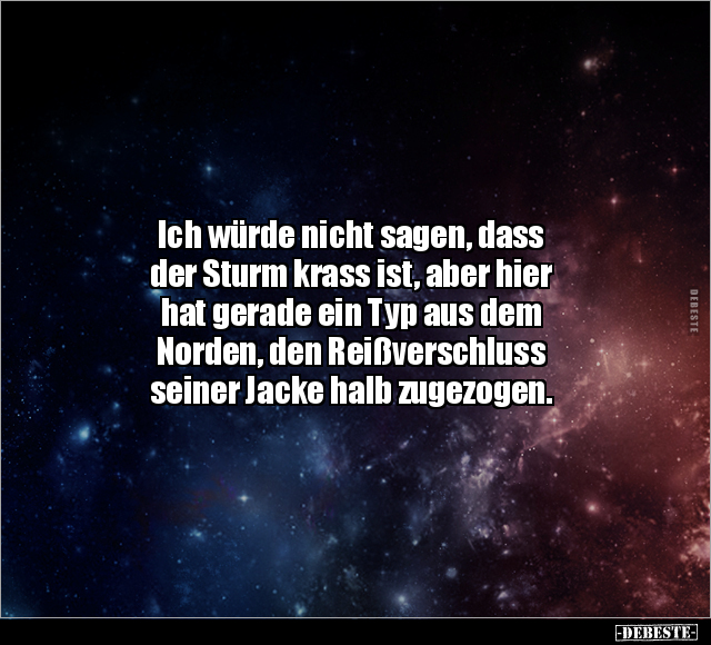 Ich würde nicht sagen, dass der Sturm krass ist, aber hier hat gerade ein Typ aus dem Norden, den Reißverschluss seiner Jacke halb zugezogen.