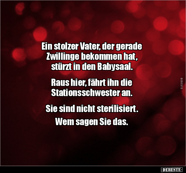 Ein stolzer Vater, der gerade Zwillinge bekommen hat, stürzt in den Babysaal. Raus hier, fährt ihn die Stationsschwester an. Sie sind nicht sterilisiert. Wem sagen Sie das.