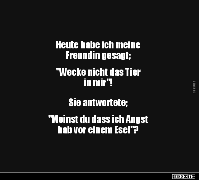 Heute habe ich meine Freundin gesagt; "Wecke nicht das Tier in mir"! Sie antwortete; "Meinst du dass ich Angst hab vor einem Esel"?