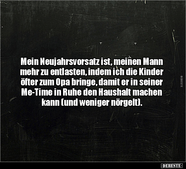 Mein Neujahrsvorsatz ist, meinen Mann mehr zu entlasten, indem ich die Kinder öfter zum Opa bringe, damit er in seiner Me-Time in Ruhe den Haushalt machen kann (und weniger nörgelt).