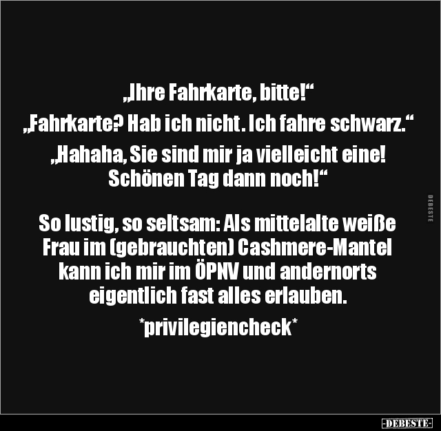 „Ihre Fahrkarte, bitte!“ „Fahrkarte? Hab ich nicht. Ich fahre schwarz.“ „Hahaha, Sie sind mir ja vielleicht eine! Schönen Tag dann noch!“ So lustig, so seltsam: Als mittelalte weiße Frau im (gebrauchten) Cashmere-Mantel kann ich mir im ÖPNV und andernorts eigentlich fast alles erlauben. *privilegiencheck*
