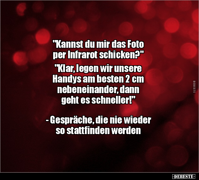 "Kannst du mir das Foto per Infrarot schicken?" "Klar, legen wir unsere Handys am besten 2 cm nebeneinander, dann geht es schneller!" - Gespräche, die nie wieder so stattfinden werden