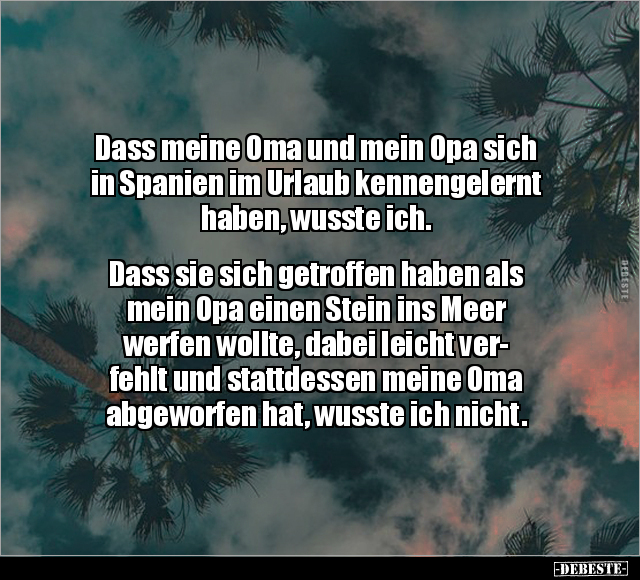 Dass meine Oma und mein Opa sich in Spanien im Urlaub kennengelernt haben, wusste ich. Dass sie sich getroffen haben als mein Opa einen Stein ins Meer werfen wollte, dabei leicht ver- fehlt und stattdessen meine Oma abgeworfen hat, wusste ich nicht.
