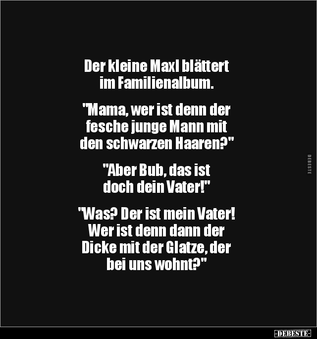 Der kleine Maxl blättert im Familienalbum. "Mama, wer ist denn der fesche junge Mann mit den schwarzen Haaren?" "Aber Bub, das ist doch dein Vater!" "Was? Der ist mein Vater! Wer ist denn dann der Dicke mit der Glatze, der bei uns wohnt?"