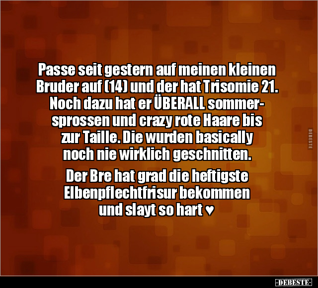 Passe seit gestern auf meinen kleinen Bruder auf (14) und der hat Trisomie 21. Noch dazu hat er ÜBERALL sommer- sprossen und crazy rote Haare bis zur Taille. Die wurden basically noch nie wirklich geschnitten. Der Bre hat grad die heftigste Elbenpflechtfrisur bekommen und slayt so hart ♥