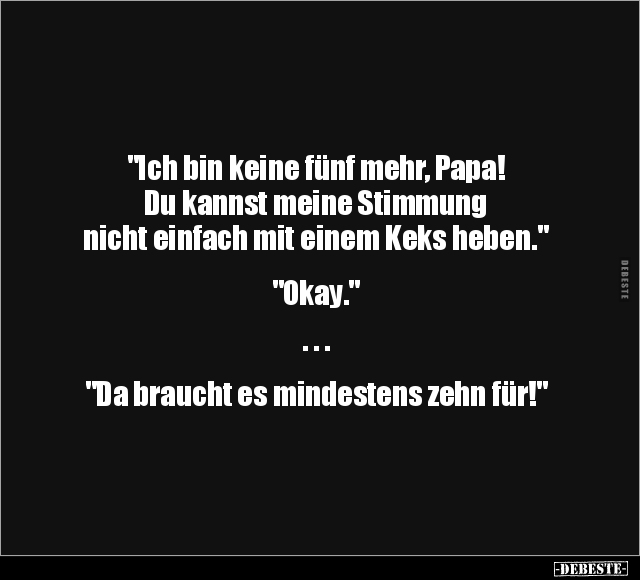 "Ich bin keine fünf mehr, Papa! Du kannst meine Stimmung nicht einfach mit einem Keks heben." "Okay." . . . "Da braucht es mindestens zehn für!"