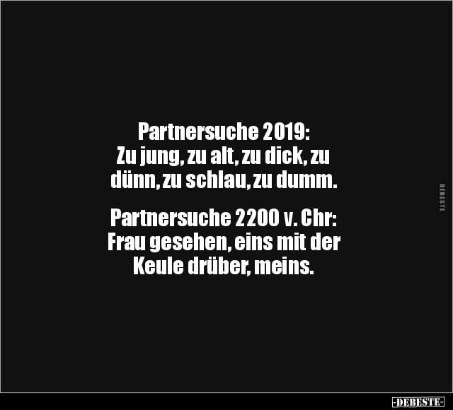 Partnersuche 2019: Zu jung, zu alt, zu dick, zu dünn, zu schlau, zu dumm. Partnersuche 2200 v. Chr: Frau gesehen, eins mit der Keule drüber, meins.