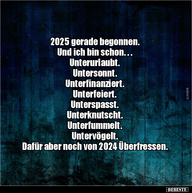 2025 gerade begonnen. Und ich bin schon. . . Unterurlaubt. Untersonnt. Unterfinanziert. Unterfeiert. Unterspasst. Unterknutscht. Unterfummelt. Untervögelt. Dafür aber noch von 2024 Überfressen.