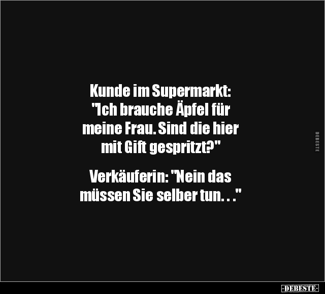Kunde im Supermarkt: "Ich brauche Äpfel für meine Frau. Sind die hier mit Gift gespritzt?" Verkäuferin: "Nein das müssen Sie selber tun. . ."