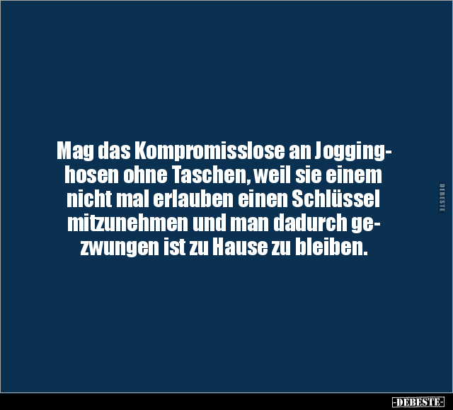 Mag das Kompromisslose an Jogging- hosen ohne Taschen, weil sie einem nicht mal erlauben einen Schlüssel mitzunehmen und man dadurch ge- zwungen ist zu Hause zu bleiben.