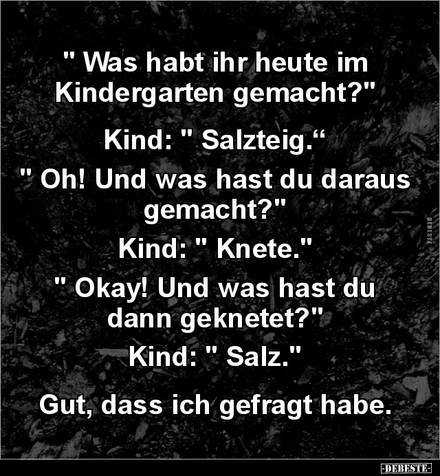 " Was habt ihr heute im Kindergarten gemacht?" Kind: " Salzteig.“ " Oh! Und was hast du daraus gemacht?" Kind: " Knete." " Okay! Und was hast du dann geknetet?" Kind: " Salz." Gut, dass ich gefragt habe.