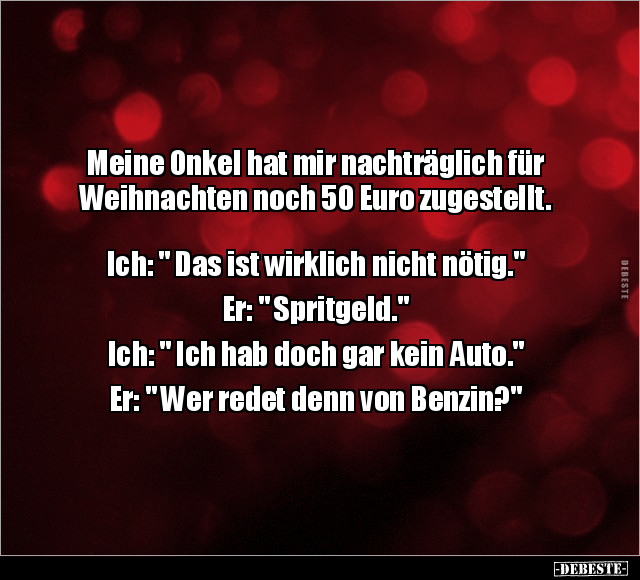 Meine Onkel hat mir nachträglich für Weihnachten noch 50 Euro zugestellt. Ich: " Das ist wirklich nicht nötig." Er: " Spritgeld." Ich: " Ich hab doch gar kein Auto." Er: " Wer redet denn von Benzin?"