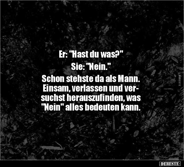 Er: "Hast du was?" Sie: "Nein." Schon stehste da als Mann. Einsam, verlassen und ver- suchst herauszufinden, was "Nein" alles bedeuten kann.