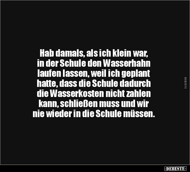 Hab damals, als ich klein war, in der Schule den Wasserhahn laufen lassen, weil ich geplant hatte, dass die Schule dadurch die Wasserkosten nicht zahlen kann, schließen muss und wir nie wieder in die Schule müssen.