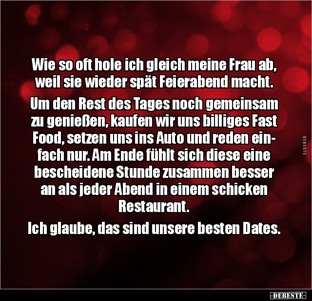 Wie so oft hole ich gleich meine Frau ab, weil sie wieder spät Feierabend macht. Um den Rest des Tages noch gemeinsam zu genießen, kaufen wir uns billiges Fast Food, setzen uns ins Auto und reden ein- fach nur. Am Ende fühlt sich diese eine bescheidene Stunde zusammen besser an als jeder Abend in einem schicken Restaurant. Ich glaube, das sind unsere besten Dates.